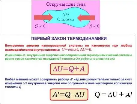 Первый закон является обобщением опытных фактов. Из этого закона вытекает, что энергия не появляется из ниоткуда и не исчезает в никуда, она лишь преобразуется из одной формы в другую и передается от одной системы к другой. Важнейшим следствием первого закона явилось утверждение о невозможности создания машины, способной совершать полезную работу без потребления энергии извне и без каких-либо изменений внутри самой машины. Такая гипотетическая машина получила название Вечного двигателя (Perpetuum mobile) первого рода. Как известно, попытки создать такую машину обязательно заканчивались провалом. Любая машина может совершать полезную работу над внешними телами только за счет получения некоторого количества теплоты от окружающих тел или уменьшения своей внутренней энергии.