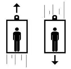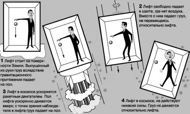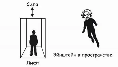 Теперь проведем другой эксперимент. Каким-то невероятнейшим образом я остался в живых после касания с землей, и теперь залезаю в другой лифт, стоящий на земле. Вы, как внешние наблюдатели, видите, как какое-то неведомое существо привязало к лифту трос и начинает с постоянной силой тянуть лифт вверх. Как будете рассуждать вы? Свою систему отсчета вы будете считать инерциальной, и вы наблюдаете, что лифт двигается с постоянным ускорением. Также вы будете считать, что в моей системе законы механики не действуют - если я выпущу из рук ключ, он тут же столкнется с полом, потому что пол движется вверх, то же самое происходит и с паспортом. Кроме того, вы видите, что если я попытаюсь прыгнуть, пол тут же достигнет меня, поэтому я вынужден всегда быть привязанным к полу. А как буду рассуждать я? Я, пожалуй, буду осознавать, что моя система отсчета уже не инерциальна, но это не влияет на абсолютное движение. Я буду считать, что мои вещи падают потому, что лифт находится в поле тяготения. Мое движение в целом похоже на движение человека на земле, и это движение объясняется полем тяготения Земли.