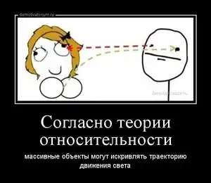 Что получается? Опять же, если в ваших и моих рассуждениях все верно, то снова можно принимать либо вашу, либо мою точку зрения. Но! Оказывается, я-то кое в чем ошибся, видимо негативно сказался полет вниз на предыдущем лифте, после которого я был как выжатый лимон! Я посчитал, что луч света невесом, но это на самом деле не так! Одним из гениальных следствий Специальной теории относительности, о которой я здесь по сути не говорил (кроме того момента, когда в моих рассуждениях промелькнул второй лифт), является то, что энергия имеет массу, а масса - энергию. Луч света несет энергию, а значит имеет массу! Инертную массу. И на всякую инертную массу гравитация будет оказывать воздействие. Почему? А снова потому, что гравитационная и инертная масса эквивалентны. Т.е. если бы я принял во внимание искривление светового луча в поле тяготения, то мои рассуждения стали бы точно такими же, как и ваши рассуждения!
