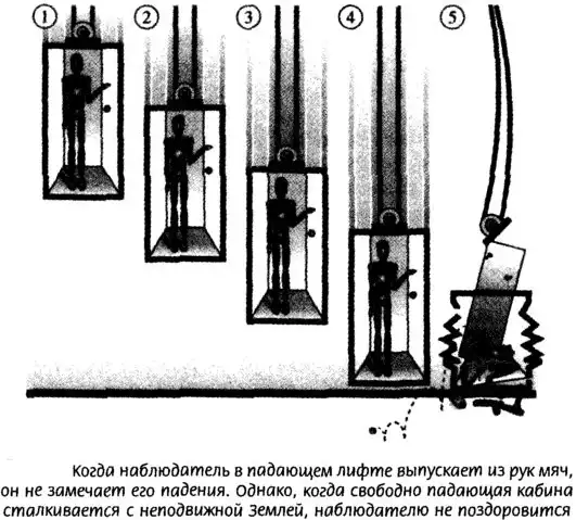 Наконец, после попытки извлечь сущность понятия массы и принципа эквивалентности тяжелой и инертной масс, мы вполне можем покататься на лифте! Эйнштейн, признанный мастер мысленных экспериментов, понял, что мысленные идеализированные эксперименты являются очень важными для формирования понимания физики. Доказательством этому может являться закон инерции, обнаруженный при размышлении над идеализированным экспериментом, где та же тележка постоянно движется без трения и без воздействия каких-либо внешних сил. Итак, представьте большой лифт на башне очень-очень высокого небоскреба - сначала мы посмотрим, что происходит в падающем лифте. Договоримся, что я, эдакий камикадзе, нахожусь в лифте, а вы - внешние наблюдатели, закупились кока-колой и поп-корном и решили просто понаблюдать за лифтом. Трос обрывается, и лифт начинает свободно падать по направлению к земле. Но я не растерялся и начинаю проводить опыты. Кстати, сопротивлением воздуха или трением мы можем пренебречь, т.к. это идеализированный эксперимент. Я вынимаю из карманов свой паспорт и ключи от машины и выпускаю их из рук. Что мы наблюдаем? Вы, внешние наблюдатели, видите, что эти предметы падают по направлению к земле с одинаковым ускорением. Выше я не зря говорил о независимости ускорения от масс предметов, а также о равенстве гравитационной и инертной масс. Ровно таким же ускорением обладает и лифт со всеми его составляющими - стены, пол, потолок! Поэтому расстояние между моими вещами и полом лифта не изменится, и я наблюдаю, что мои вещи остаются точно там же, где они были, когда я выпустил их из рук. Я могу игнорировать поле тяготения, т.к. источник этого поля отсутствует в моей системе отсчета, и я осознаю, что на мои вещи не действуют совершенно никакие силы, поэтому они остаются в покое, словно находясь в инерциальной системе. А если я, например, толкну свои ключи вверх, они будут двигаться прямолинейно и равномерно, пока не достигнут потолка лифта. Т.е. для меня внутри лифта действуют законы классической физики - мои вещи подчиняются закону инерции. Но...вся беда в том, что инерциальная система отсчета в классической физике не ограничена ни в пространстве, ни во времени, и поэтому в такой системе тело может вечно двигаться прямолинейно и равномерно. Но моя-то система отсчета жестко связана со свободно падающим лифтом! Во-первых, мои ключи рано или поздно столкнутся с потолком лифта, если я их толкну, тем самым нарушится их движение. Ну а во-вторых, что более катастрофично и неприятно, сам лифт рано или поздно столкнется с землей, и мне кранты!