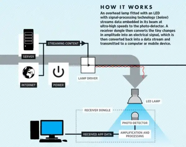 Если задуматься, такой способ выхода в Сеть может совершить небольшую революцию в мире беспроводных технологий. Ведь передача данных с помощью светодиодов, расположенных внутри ламп дневного света, гораздо быстрее, нежели Wi-Fi, а также защищена от перехвата данных, если только человек не находится в одном помещении с передатчиком и приёмником. Перехватить поток данных из соседней комнаты или с улицы у злоумышленников уже не выйдет.