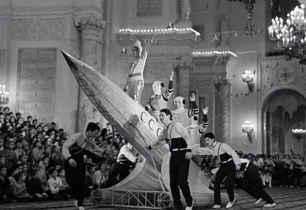 Учащиеся ПТУ пришли на кремлевский новогодний праздник в национальных костюмах. Даже лестница плотно забита! 1955 год.