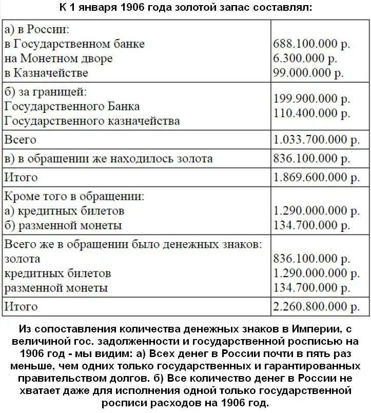 Оперируя цифрами, Нечволодов показывает, что ни России, ни другим странам, втянутым в "золотой клуб", не хватит всех мировых запасов золота для того, чтобы расплатиться по кредитам, полученным от ростовщического кагала. Поэтому не нужно удивляться, что на начало XX в. только одна Россия по государственным долгам оказалась должна более половины всех золотых денег, находящихся на земном шаре.