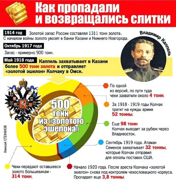 ...Захваченное в Казани золото сначала частично переводили на счета колчаковского правительства в западных банках, а потом постепенно снимали, - говорит Владимир Карелин. - Часть средств была в золотых царских империалах или слитках с клеймом русского Госбанка. Оно вывозилось через Владивосток за рубеж, в том числе в Швецию и Норвегию. После разгрома Белого движения официальной возможности распоряжаться этими средствами уже не было. Поэтому золото переплавлялось и с перебитыми клеймами утекало в Америку. Если правильно понимать эту ситуацию, то, как только золото оказалось под контролем англосаксов, они решили слить белое движение, а война, террор, анархия и прочие их деяния, это управляемый хаос, где можно прилично обогатиться.