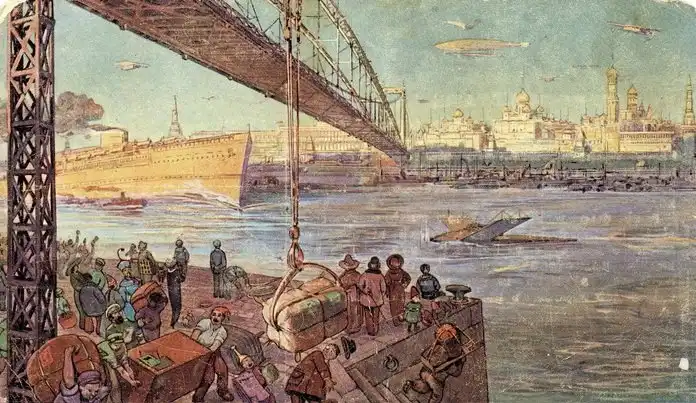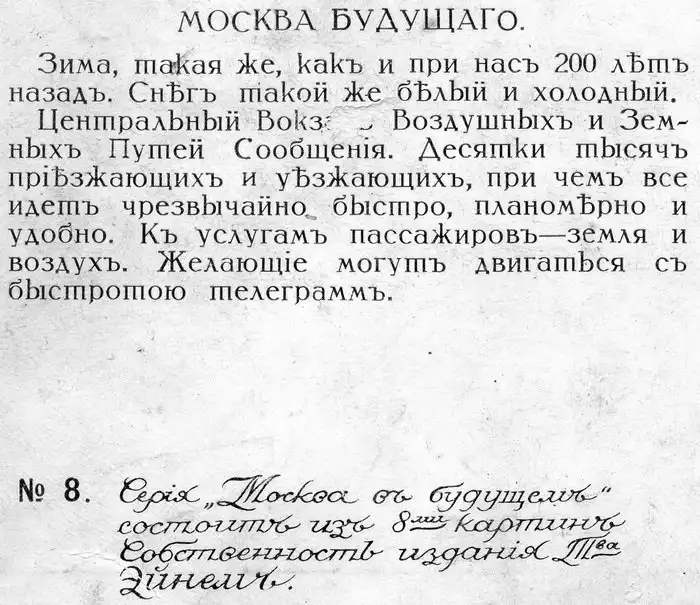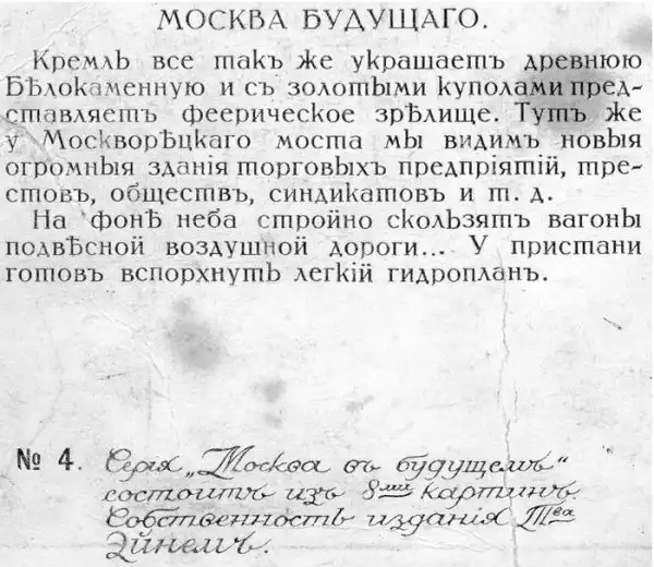 Идею предсказания будущего подхватили и в России. На кондитерской фабрике "Товарищество Эйнем" (позже "Красный Октябрь") в 1914 году производили продукцию с наименованием "Москва будущего" со вставкам карточек на соответствующую тему, к которым прилагалось описание фантазийного сюжета. В тогдашней империи пошли дальше и попробовали продемонстрировать своим современникам 21 век.