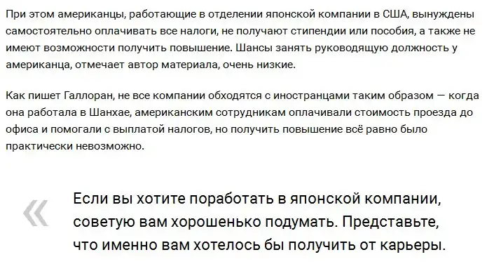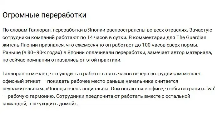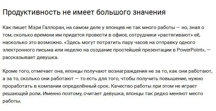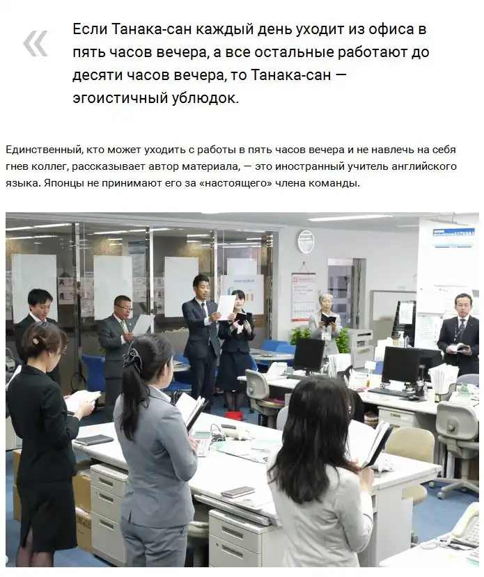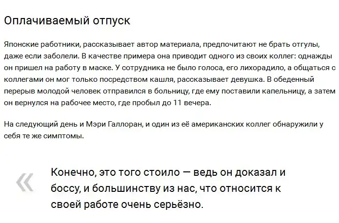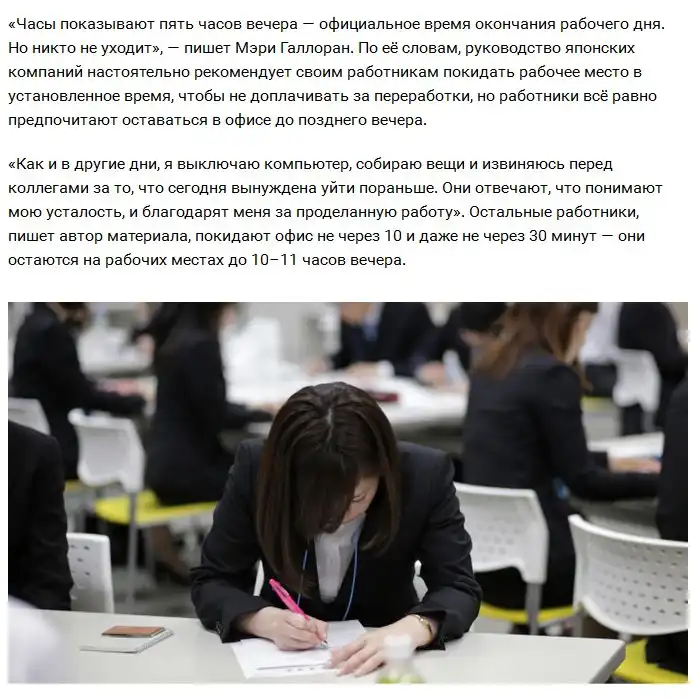 Американский блогер Мэри Галлоран проработала в Японии 6 лет и решила рассказать о корпоративной культуре работников этой страны. Девушка отметила, что японцы привыкли работать сверх нормы, практически не пользуются отпусками и больничными, а также редко увольняются со своего места работы. Более подробно обо всем этом читайте далее.