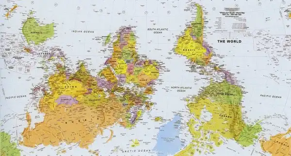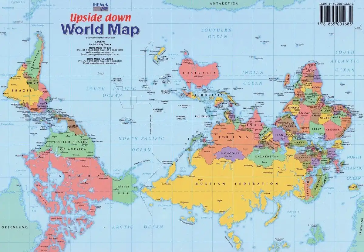 Существует общий стереотип, что доминирует то, что находится выше, а то, что ниже, находится в подчиненном положении. Австралийцы не только проводят вертикальную ось мира через свой материк, так еще и помещают его сверху всех других, переворачивая карту на 180 градусов. Подобно США, они оказываются островом, лежащим между тремя океанами: Тихим, Индийским и Южным. Еще важную роль начинает играть Антарктида, спрятанная в самый низ на всех прочих картах.