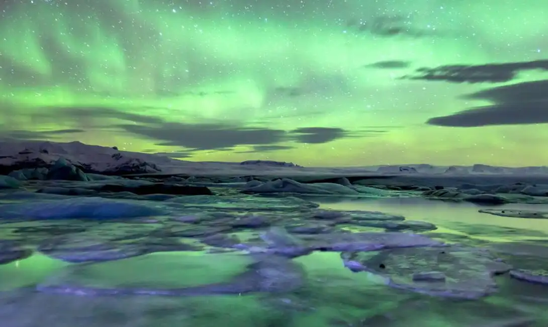 Ледник у озера Йокюльсадлон и находящийся неподалеку замороженный пляж по-праву считаются одними из главных чудес страны. Черный вулканический песок противопоставлен ледяным глыбам, белой каймой охватывающим весь берег. И, просто затем, чтобы вечер перестал быть томным — все это отражает раскинувшееся в небе северное сияние.