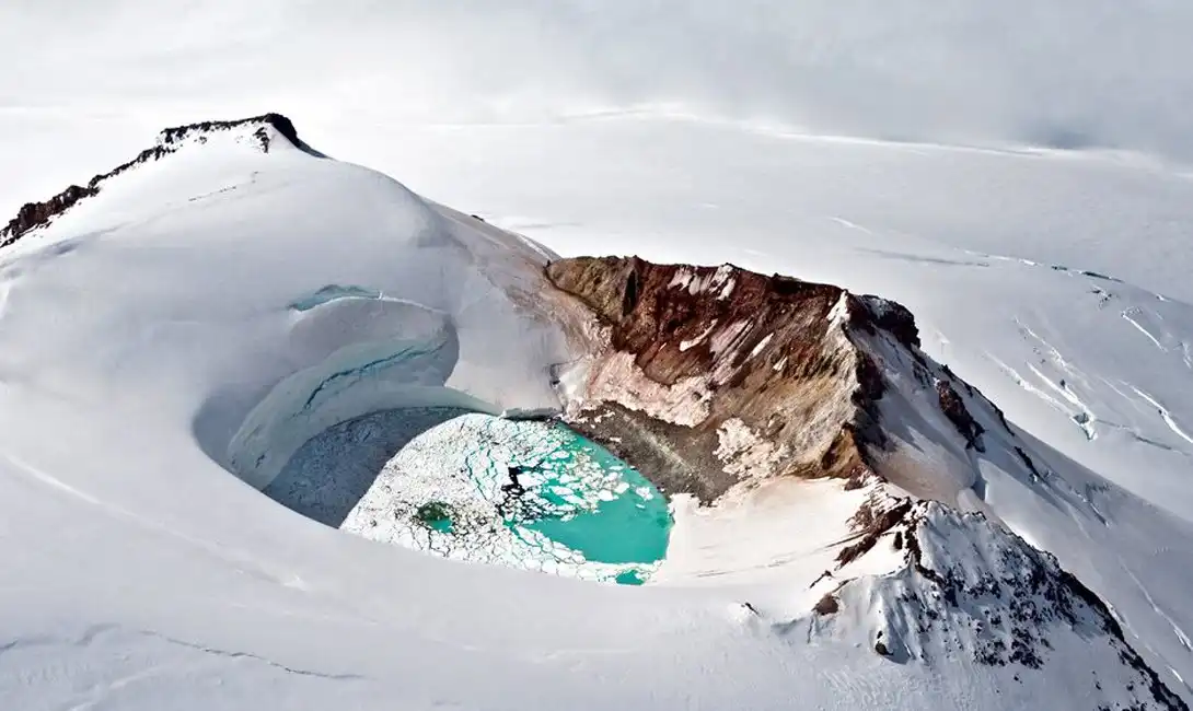 Гора Дуглас — стратовулкан, расположенный на южной оконечности Аляски. Озеро в его кратере вполне могло бы сойти за санаторный курорт: кислотность и температура воды здесь вполне подходящие.
