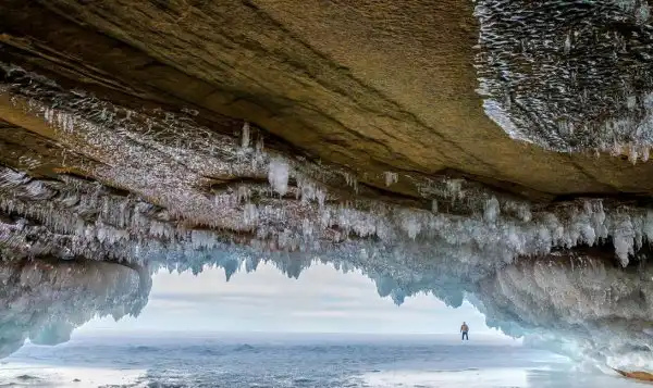 Когда температура падает и воды Верхнего озера покрываются льдом, песчаные пещеры в глубинах острова Апостола превращаются в настоящие декорации к волшебной сказке. Небольшие водопады замерзают каскадами блестящих додэкаэдров, а путешественники могут добраться сюда, просто перейдя озеро пешком.