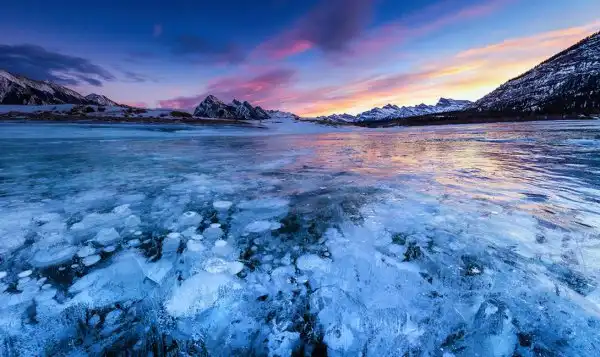 Канадское озеро Абрахам (в некоторой транскрипции — Авраам), становится еще более впечатляющим зимой, когда толстый слой льда наполняется вмерзшими воздушными пузырьками. На самом деле, этот воздух выходит из гейзеров, которые вновь начинают функционировать с приходом весны.