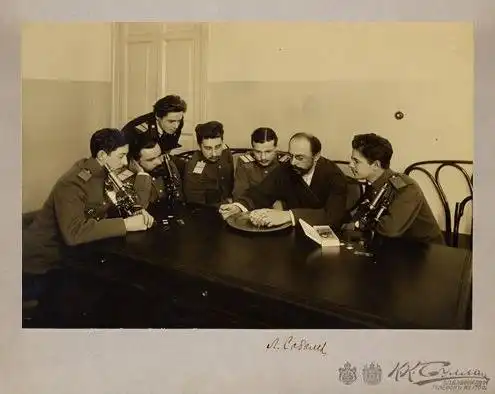 Леонид Васильевич Соболев (1876-1919) - биолог, который первым доказал на опыте, что островки Лангерганса в поджелудочной железе вырабатывают некий гормон (позднее названный инсулином), регулирующий уровень сахара в крови. Сообщение сделано им в 1900 году. На этом снимке Соболев - единственный в штатском. Он приват-доцент, преподающий на кафедре патологической анатомии петербургской Военно-Медицинской Академии. Примерно через год он выйдет в отставку по болезни, умрёт от рассеянного склероза в клинике своей ВМА голодной весной 19-го года. Фото: Карл Булла, около 1911 годаИсточник