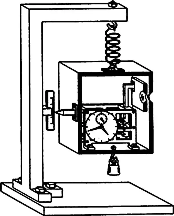 Естественно, что ночью Бор не мог спать и тщательно обдумывал эксперимент Эйнштейна, пытаясь найти в нем изъян. Обратив свое внимание на взвешивание ящика со светом, он снова модифицировал экспериментальную установку Эйнштейна. Бор подвесил ящик на пружину, закрепленную на неподвижной рамке (на рисунке ниже). На вертикальную часть рамки он нанес шкалу, а к ящику приделал стрелку. Для того, чтобы стрелка строго показывала ноль, к дну ящика был подвешен грузик, т.е. это было первоначальное состояние ящика со светом до открытия заслонки. После того, как открывается заслонка, вылетает фотон, ящик становится легче и пружина его поднимает. Для того, чтобы узнать потерю массы, нужно вернуть стрелку в ноль, подвесив к дну ящика соответствующий грузик. Далее, для того, чтобы посмотреть на показания шкалы, нужно установку осветить. Как уже говорилось выше, это приведет к неопределенности импульса ящика, и чем тщательнее мы пытаемся измерить положение ящика, устанавливая стрелку в ноль с помощью грузика, тем больше становится неопределенность, связанная с одновременным измерением его импульса.