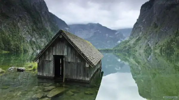 В единственном высокогорном национальном парке Германии "Берхтесгаден", охватывающем территорию свыше 210-ти км^2 и входящем в наследие ЮНЕСКО, посреди озера "притаилась" хлипкая рыбацкая хижина. Она настолько органично вписывается в местный девственный природный пейзаж, что трудно представить, что этот домик был создан руками человека.