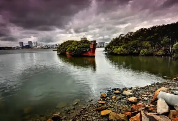 Это всеми забытое судно, находящееся в заливе Homebush Bay на южном берегу реки Парраматта, неподалёку от австралийского Сиднея. Во время Второй мировой войны SS Ayrfield, построенный для перевозки угля в 1911-м году в Великобритании и достигающий 80-ти м в длину, использовался американскими войсками как транспортировщик боеприпасов. Неизвестно, как это случилось, но корабль забросили, в результате сегодня он представляет собой что-то вроде большого искусственного острова.