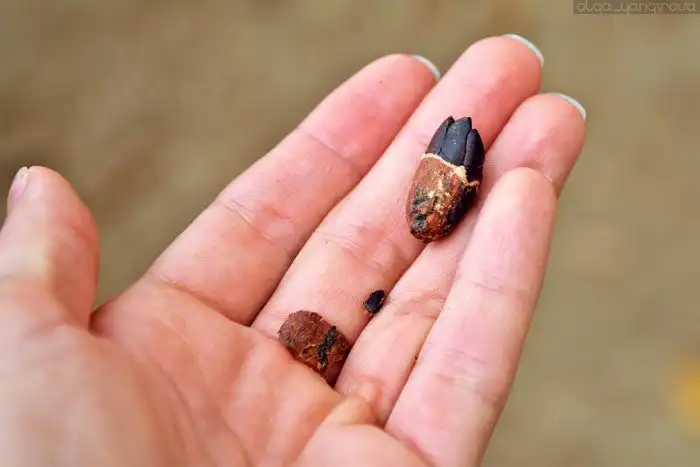 Наконец, мы дошли до самого важного процесса. Собранные спелые плоды какао рассекаются ножом мачете на части. Из плодов извлекается белая мякоть с какао-бобами внутри. Бобы отделяются от мякоти, помещаются в большие деревянные поддоны и накрываются банановыми листьями.