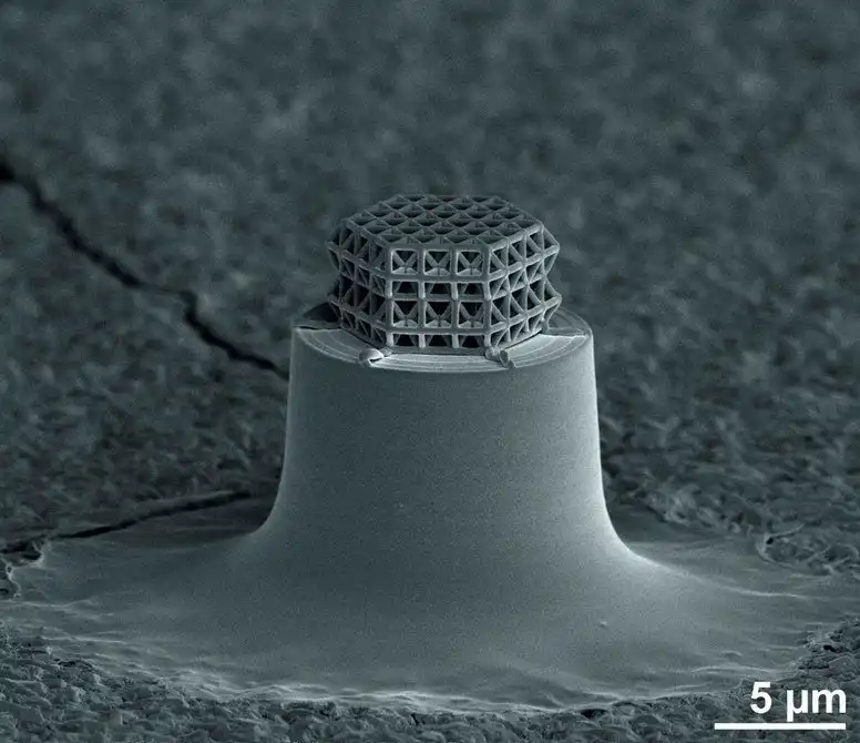 Ученые из Технологического института Карлсруэ (KIT) создали самую маленькую в мире решетчатую структуру. Состоящая из распорок и скоб длиной не более 1 микрометра и 200 нанометров в диаметре, конструкция обладает общим размером менее 10 микрометров, но при этом может похвастаться повышенным по сравнению с большинством твердых материалов коэффициентом прочности.