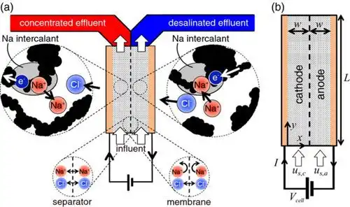Исследователи были вдохновлены натриево-ионными батареями, которые содержат соленую воду. В этих устройствах два отсека с электродами, разделенные сепаратором, через который ионы могут перемещаться. При разряде аккумулятора, натриевые и хлоридные ионы - два элемента соли - тянутся к одному отсеку, оставляя опресненную воду в другом.
