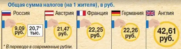 Общая сумма налогов на одного жителя в России была более чем вдвое ниже, нежели в Австрии, Франции и Германии, а по сравнению с Англией - меньше более чем в четыре раза.