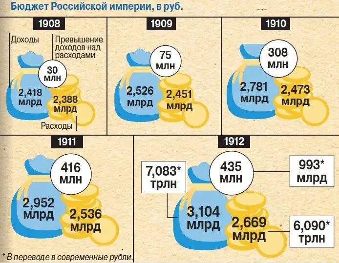 За последние десять лет до Первой мировой войны превышение государственных доходов над расходами составило 2,4 млрд руб. Эта сумма представляется тем более внушительной, что в царствование Николая II были понижены железнодорожные тарифы и отменены выкупные платежи за земли, отошедшие в 1861 г. к крестьянам от их бывших помещиков, а также некоторые налоги.