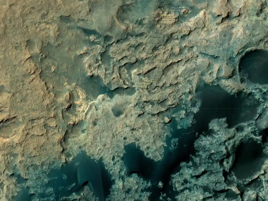 Сине-зеленые оттенки темные дюны Марса приобретают благодаря оливину - тоже вулканической породе, получившей свое название, за зеленый цвет, как у оливок.