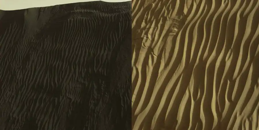 Разница в физических свойствах песка и объясняет тот факт, что темные и рыжие дюны не перемешиваются. Хотя поведение песка взаимодействующего с ветром - это сейчас ведущее направление в исследованиях, и еще много неизвестных. Марсоход может простоять на одном месте несколько месяцев только для того чтобы самостоятельно, с поверхности увидеть как дюны ползут.