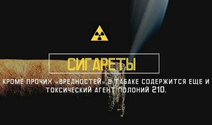 Средний курильщик получает за год дозу радиации, эквивалентную примерно 300 рентгенографиям грудной клетки из-за радиоактивных изотопов, содержащихся в дыму.