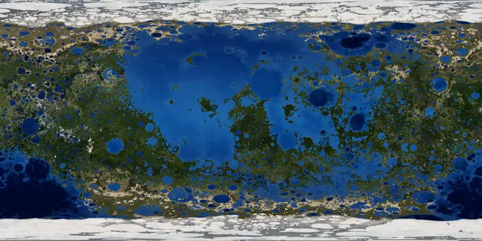Гипотетическая карта терраформированной Луны. Низины лунных морей залиты океанами, а кратеры превращены в озера и пруды. Очевидно что гипотетическая гидросфера Луны излишне преувеличена, ибо делает негодными для проживания огромные площади лунных равнин