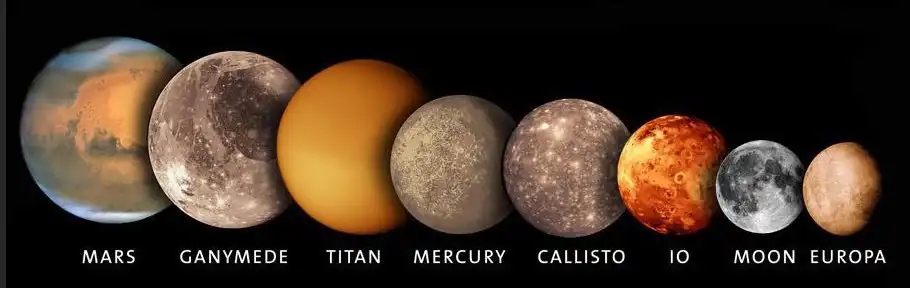Из всех 173 известных спутников планет в солнечной системе, Луна надежно входит в пятерку наиболее крупных и массивных лун. Спутник Сатурна Титан и спутник Юпитера Ганимед, по своим размерам занимают промежуточное положение между Луной и Марсом, будучи вдвое тяжелее Луны. Диаметр второй по величине луны Юпитера Каллисто лишь на 200 км уступает Титану, но на 1200 км больше самого геологические активного спутника в солнечной системе - Ио. Ио по размерам, плотности и массе очень близок к нашему естественному спутнику. Только ему из всей пятерки спутников гигантов Луна уступает по средней плотности (на 5%) и силе тяжести (на 10%) у своей поверхности. Сила тяжести на Ганимеде и Титане на 15% ниже, чем на Луне. Несмотря на двойное превосходство по массе, вторая космическая скорость у обоих небесных тел лишь на 12% (среднее значение) выше лунной.