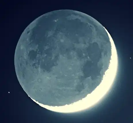 Ночная сторона Луны почти не видна невооруженным глазом из за яркости земной атмосферы. Однако при необходимой выдержке фототехники открывается вид на лунную поверхность, освещенную голубым светом Земли