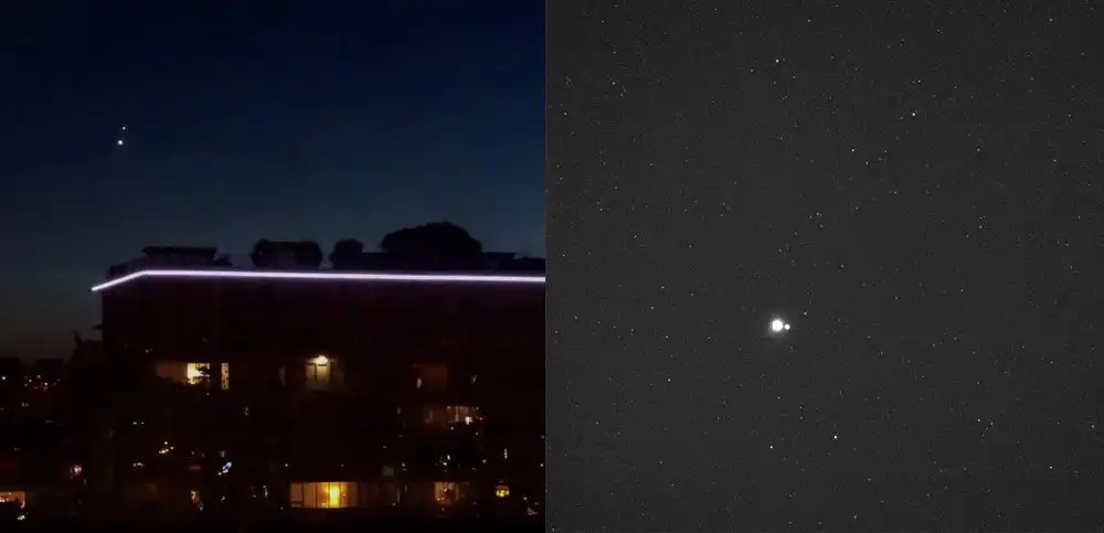Вид Юпитера и Венеры в небе Земли (лето 2015 года), давал довольно точное представление о виде Земли и Луны в небе Венеры в период противостояний. На снимке справа Земля и Луна снятые с орбиты Меркурия межпланетным зондом Мессенджер