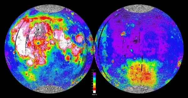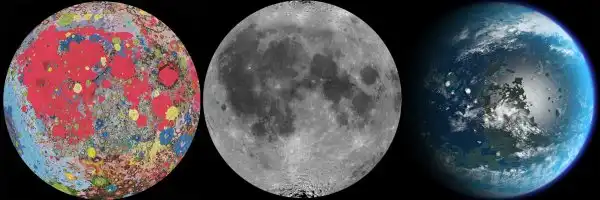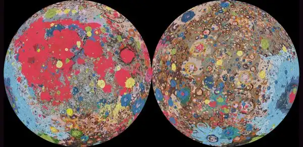 С точки зрения селенологии, Луна выглядит куда более пестро и разнообразно, нежели дихромный мир в глазах неискушенного наблюдателя. Поверхность Луны формировалась в течении 4,5 млрд лет, через чередование 5 различных геологических периодов (по цветам). Одни из наиболее древних структур отмечены коричневым и темно синим цветами, более поздние красным и наиболее молодые - желтым, это ударные кратеры коперниковской эпохи (по имени кратера Коперник), возрастом около миллиарда лет