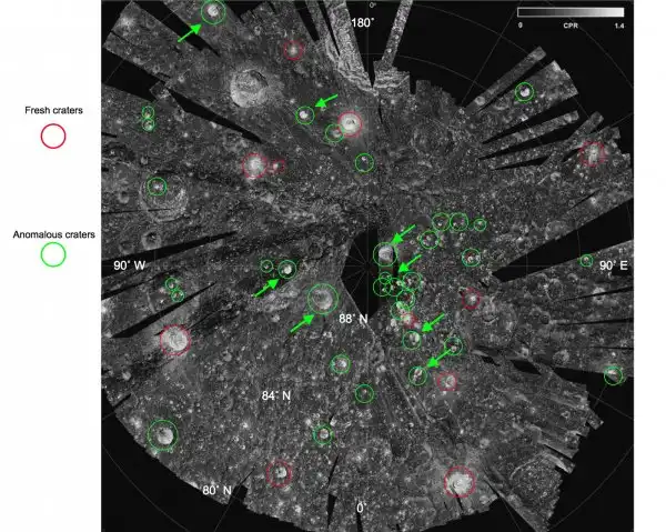 В полярных кратерах обозначенных зеленым кругом, радиоволны лучше всего отражаются грунтом "вечно" скрытым от солнечных лучей. Это прямо указывает на наличие в грунте водяного льда, в отличие от относительно молодых кратеров выделенных красным кругом, отражательная способность (альбедо) радиоволн в которых не зависит от освещенности лучами Солнца