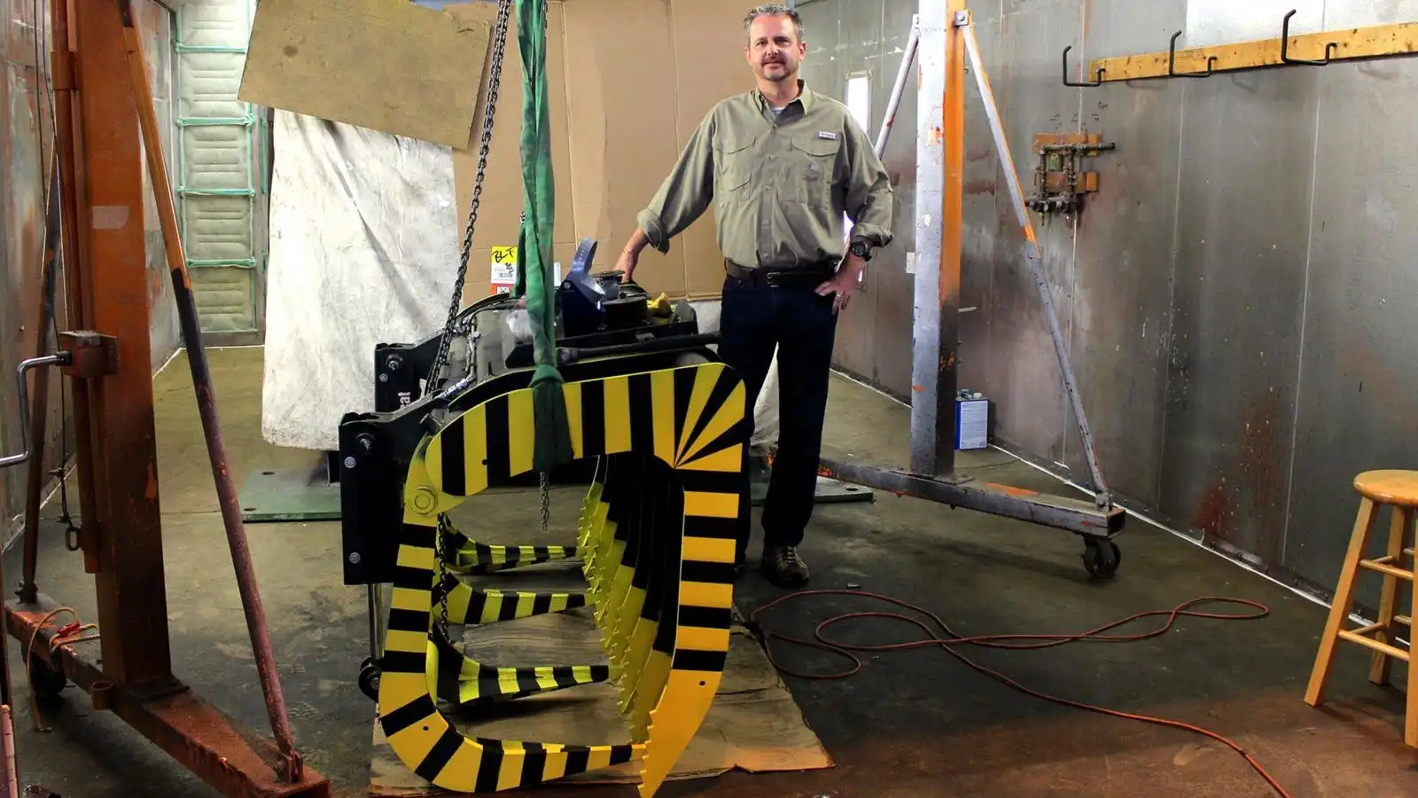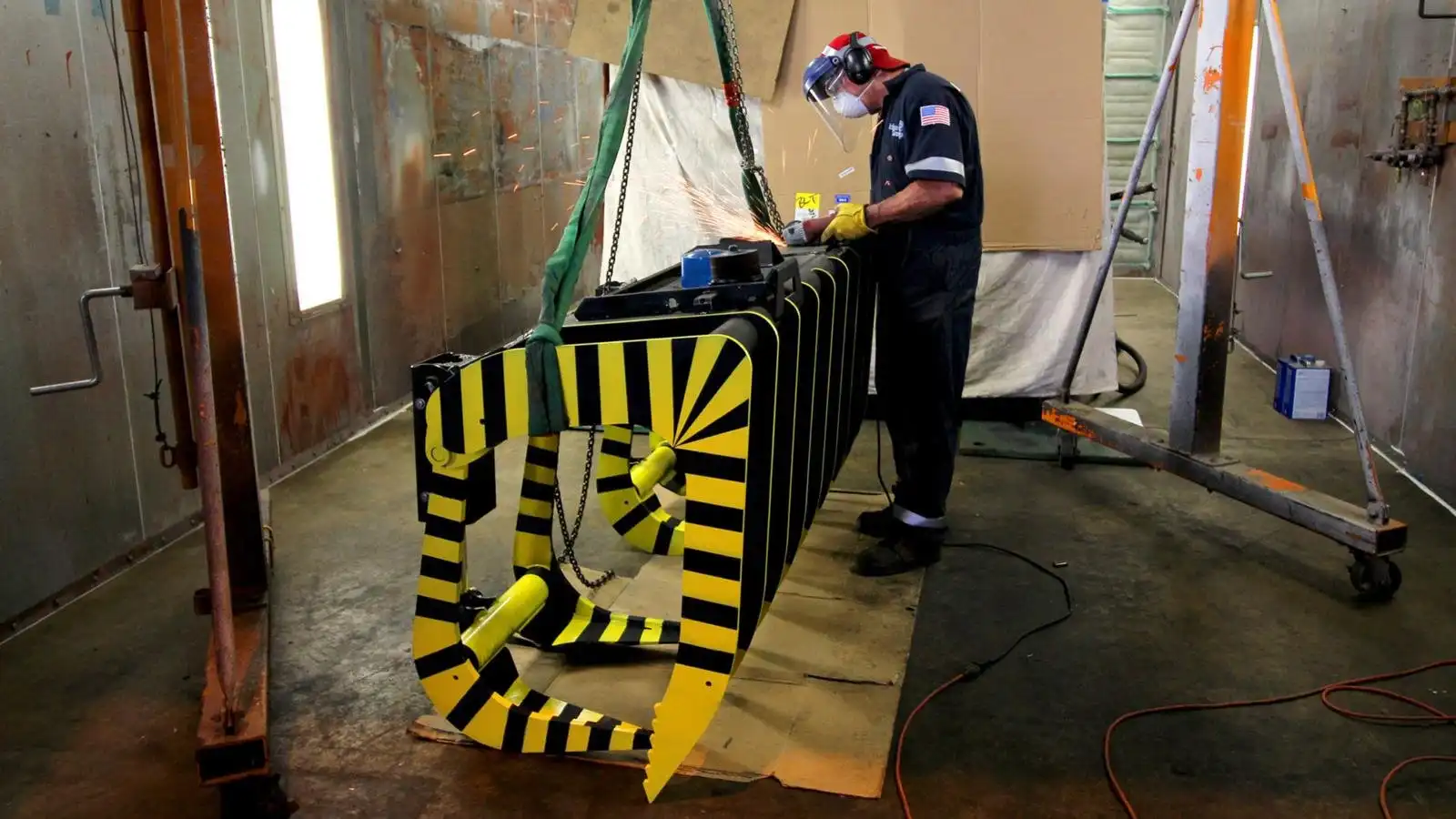 Стив Сент-Амур проезжает к хлипкой стоянке за пределами объекта. Он проходит через здание к задней части, где человек в спецодежде и защитной маске с шумом обрабатывает гигантский металлический коготь. Искры летят от гигантского приспособления. "Это оно", - говорит он. Изначально это устройство предназначалось для гусеничных экскаваторов, чтобы они подбирали бревна в лесной промышленности, то теперь стало надежной Элдреда.