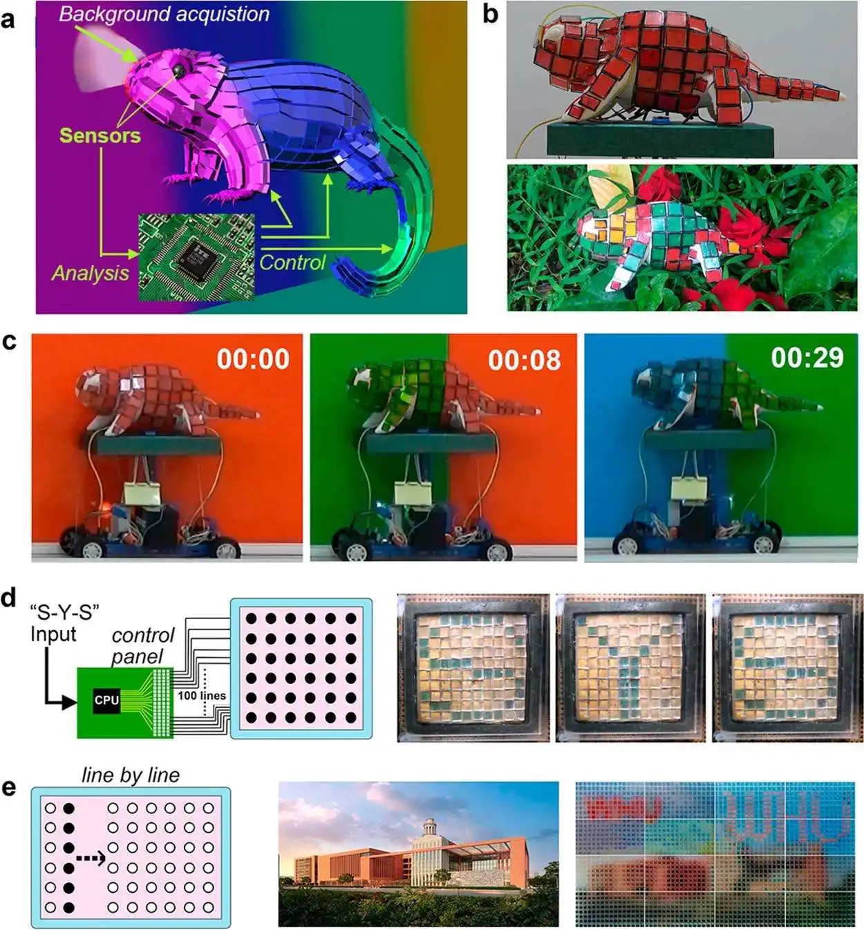 (a-c) Созданный робот-хамелеон, который способен менять цвет, приспосабливаясь к окружающей обстановке. (d-c) Схожую технологию можно использовать и для создания "статических" дисплеев, например, для рекламных банеров