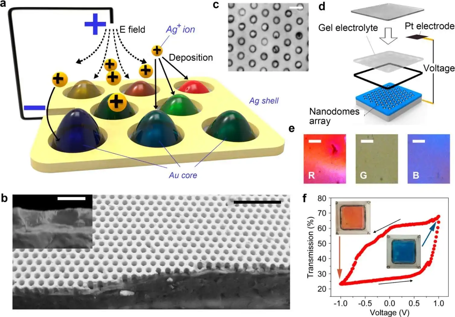 Прикладывая напряжение (~1.5 В) можно довольно быстро (ведь речь идёт о наночастицах) осаждать небольшие количества серебра на островки золота внутри пор и таким образом изменять оптические свойства системы. Например, легко управлять отражением света в пределах 420 - 650 нм, что практически перекрывает весь видимый спектр. А приложение обратного напряжения позволяет переводить серебро в ионы, распределённые в геле.
