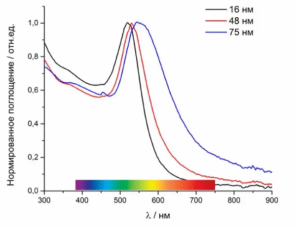 В зависимости от диаметра наночастиц длина волны света, при которой происходит такое резонансное поглощение, может варьироваться, как и в случае с квантовыми точками. Дополнительно о данном эффекте можно посмотреть это видео (лекция, прочитанная для участников 9-ой НаноОлимпиады)