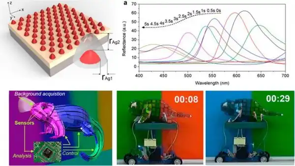 Обычно научные изыскания на этом и заканчиваются: мол, мы вот показали, что это работает, остальное не наша задача. Однако коллектив авторов решил не останавливаться на достигнутом и создал робота-хамелеона, состоящего из небольших пластин, которые изменяют цвет. Робот напичкан датчиками и способен анализировать окружающую цветовую гамму, подстраиваясь по неё.