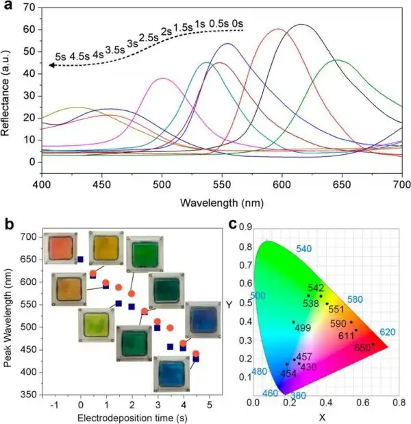 Полноценная демонстрация возможностей устройства изменять цвет при приложении электрического поля: (a) спектры отражения, (b) зависимость положения максимума отражения от времени осаждения серебра (всего несколько секунд!), (с) Хроматическая диаграмма с цветами, полученными в работе