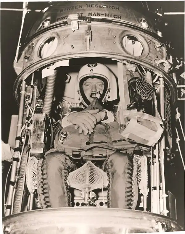 Киттингер сидит в капсуле, прежде чем подняться в стратосферу во время проекта Manhigh. Июнь 1957 года