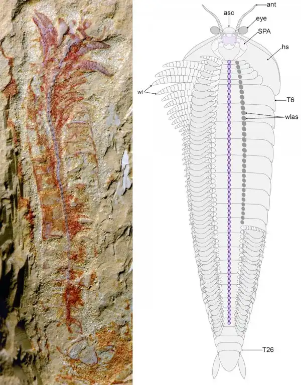 Удивительным является то, что на породе отпечатался не только хитиновый панцирь со всеми деталями, но и нервная система животного. Это почти невероятная удача, и уж точно лучший экземпляр сохранившейся структуры нервной системы вымершего миллионы лет назад животного. Обычно сохраняются только твердые части тела, вроде зубов, костей, хитиновых оболочек. Ткани минерализуются чрезвычайно редко, а "цветная" окаменелость такого типа вообще уникальна. По центру всей окаменелости видна четкая линия фиолетового цвета, это так называемый нервный тяж (древний "спинной мозг"). На линии видны утолщения - это ганглии, располагавшиеся между каждой из пар ног животного.