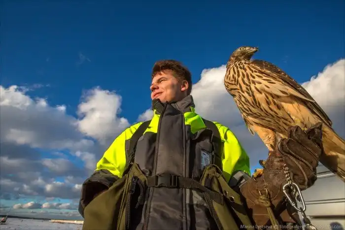 Когда в поле зрения появляется нарушитель, ястреб срывается с насеста – у Ивана на левой руке специальная толстая кожаная перчатка для транспортировки птицы.