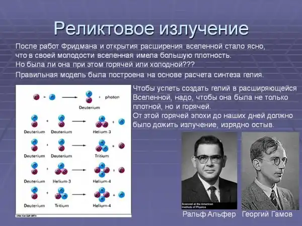 Коллегам Гамова, Ральфу Альферу и Роберту Герману, оставалось вычислить, какая энергетическая плотность у излучения сейчас. Ответ был такой: 2,7 градуса Кельвина (инженеры и астрономы сопоставляют энергии и температуру идеального нагретого тела, которое излучало бы точно так же). Статья с результатами появилась не в астрономическом, а в физическом журнале и потому осталась без внимания. Джереми Бернстайн, который наиболее ярко запечатлел сей эпизод, списывает это на свойственную физикам нелюбовь к космологии, причины которой удачнее всего выразил Лев Ландау: "Космологи часто ошибаются, зато никогда не сомневаются".