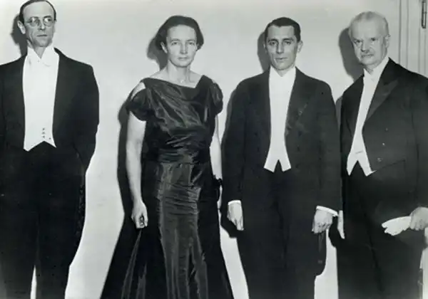 Слева направо: Джеймс Чедвик, Ирен Жолио-Кюри, Фредерик Жолио