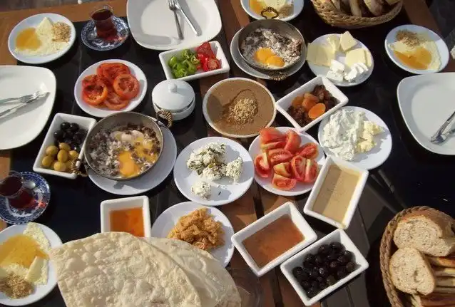 Что входит: фета, помидоры, огурцы, оливки, пряные турецкие колбаски, турецкий чай с тостами и вишнёвым джемом