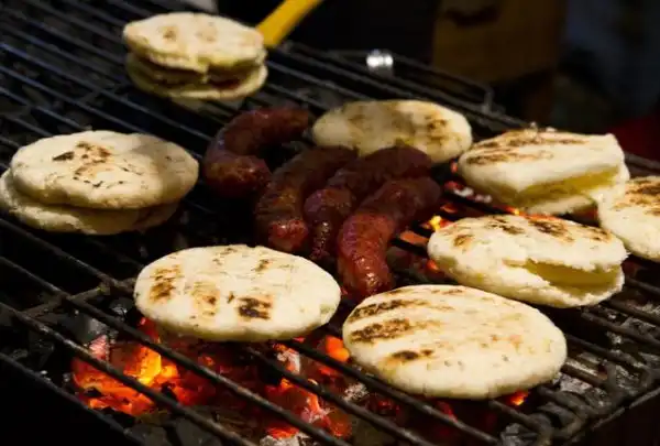 Что входит: кукурузные лепёшки арепа с маслом и солёным сыром, где в качестве начинки используется мясо, курица, салат из авокадо, яйца или фасоль