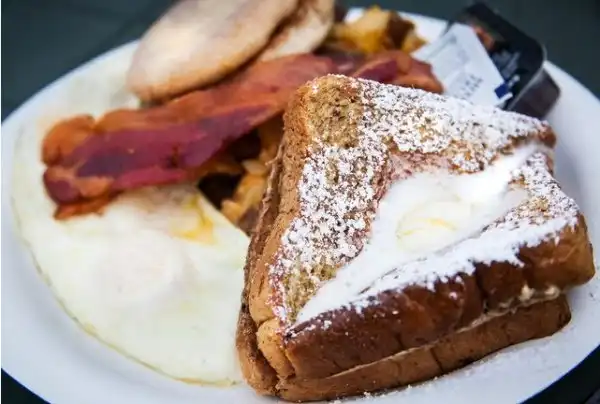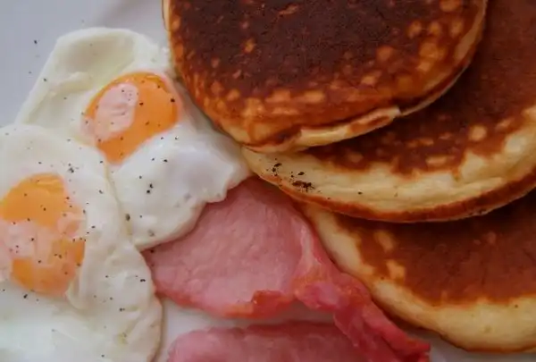 Что входит: яйца, тосты, бекон или сосиски, блины, жареный картофель