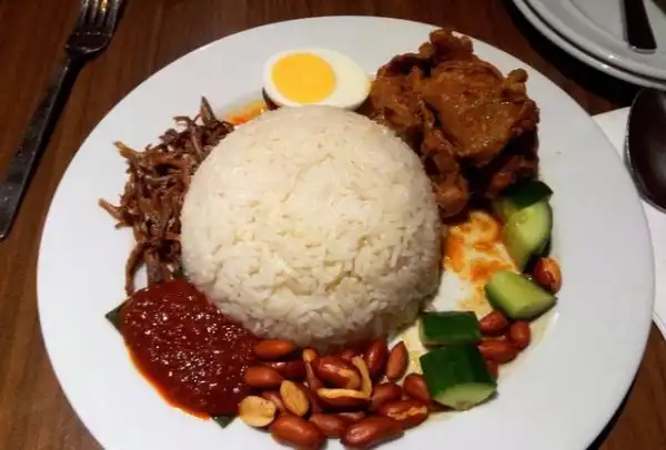 Что входит: рис наси лемак, сваренный на кокосовом молоке, с вареным яйцом, анчоусами, острым соусом и арахисом