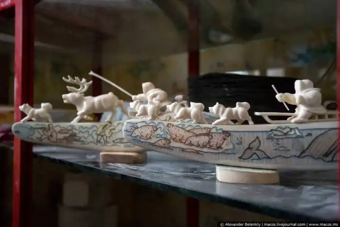 Что везут с Чукотки? Главный сувенир – поделки из бивней моржей. Фигурки, изображающие чукч или диких животных, будут преследовать вас повсюду, а продавцы уговаривать купить. А ведь это одни из самых дорогих в мире сувениров: моржовая кость стоит, как золото! И относительно небольшая фигурка может обойтись в тридцать тысяч рублей.