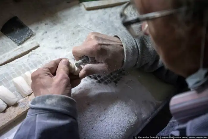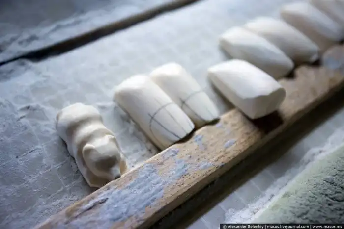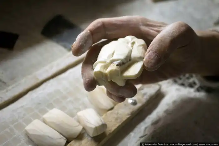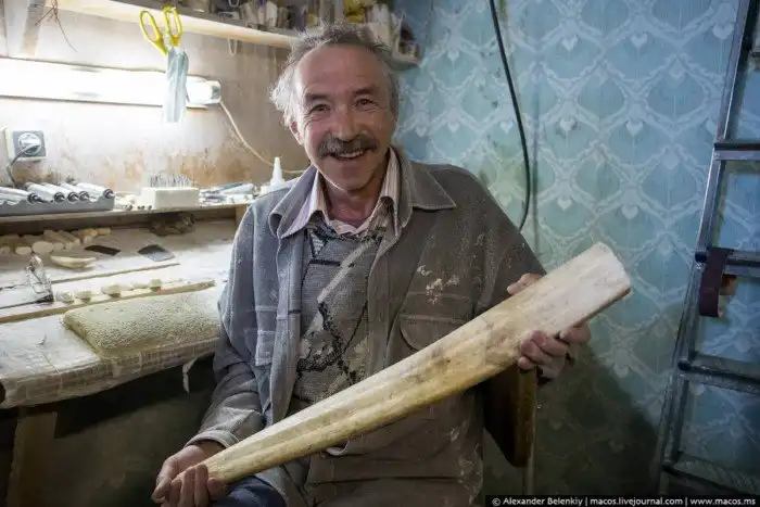 Было странно наблюдать, какой такой дорогой материал практически валяется на полках. На самом деле — вылёживаестся. Нужен минимум год с момента добычи, чтобы бивни окончательно окостенели и были готовы к работе. Начнёшь слишком рано — раскрошится.